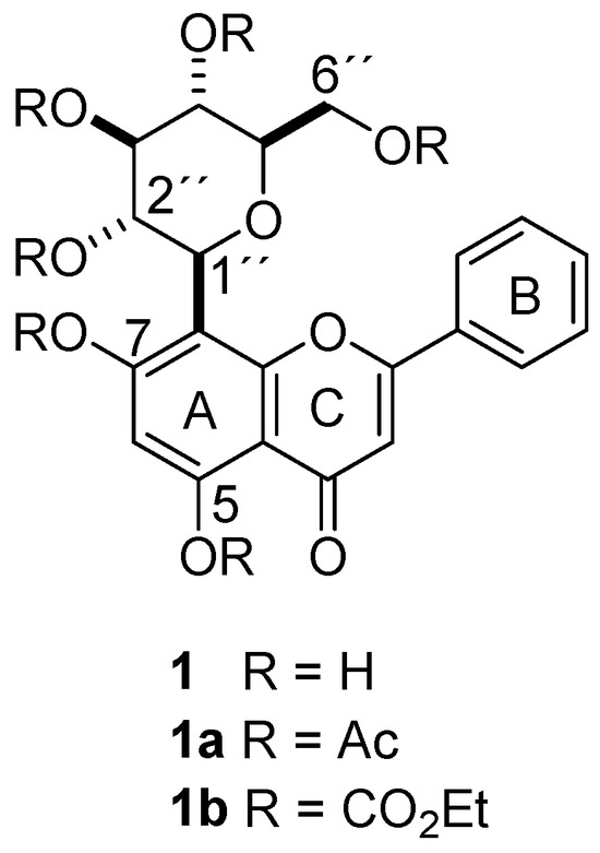 2.1. Isolation and Chemical Characterization of 8-C-β-D-Glucopyranosylchrysin (1) and Preparation of Derivatives 1a and 1b