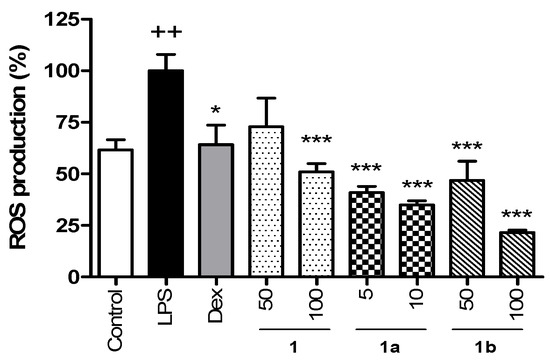 Effect of phenolics 1, 1a, and 1b on the intracellular ROS production in THP-1 macrophages stimulated by LPS. These cells were treated with concentrations of 50 and 100 µM for compounds 1 and 1b and 5 and 10 µM for compound 1a for 1 h and then stimulated with 1 µg/mL LPS for 24 h. The positive reference drug dexamethasone (Dex) was used at 1 µM. Phenolics reduced the intracellular ROS production in a concentration-dependent manner even below Control levels at the higher tested concentrations. Values are representative of four independent experiments (n = 4). Data are arithmetic means ± SEM plotted by vertical bars. Mean value was significantly different vs. Control (++ p < 0.01; Student’s t test). Arithmetic mean values were significantly different in comparison with LPS (* p < 0.05, *** p < 0.001; Kruskal–Wallis test followed by Dunn’s Multiple Comparison test.