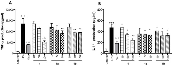 Effect of phenolics 1, 1a, and 1b on LPS-induced TNF-α (A) and IL-1β (B) production in THP-1 macrophages. These cells were treated with the concentrations of 10, 50 and 100 µM for the compounds 1 and 1b and 1, 5, and 10 µM for the compound 1a, for 1 h and then stimulated with 1 µg/mL LPS for 24 h. Cytokines were quantified in cellular supernatants by using ELISA assay. The positive reference drug dexamethasone (Dex) was used at 1 μM. Values are arithmetic means ± SEM from six independent experiments (n = 6). Data are arithmetic means ± SEM plotted by vertical bars. Mean value was significantly different vs. Control (+++ p < 0.001; Student’s t test). Arithmetic mean values were significantly different in comparison with LPS group (* p < 0.05, ** p < 0.01, *** p < 0.001; one-way ANOVA followed by Bonferroni’s Multiple Comparison test).