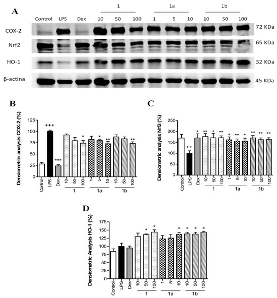 Effect of phenolics 1, 1a, and 1b on the pro-inflammatory COX-2 expression and the Nrf2/HO-1 signaling pathway in THP-1 macrophages stimulated by LPS. These cells were treated with concentrations of 10, 50, and 100 µM for compounds 1 and 1b and 1, 5, and 10 µM for compound 1a for 1 h and then stimulated with 1 µg/mL LPS for 24 h. The positive reference drug dexamethasone (Dex) was used at 1 μM. (A) Representative Western blotting analysis of COX-2, Nrf2, and HO-1 proteins from the same membrane. Densitometric analysis of COX-2 (B), Nrf2 (C), and HO-1 (D) carrying out normalization to β-actin. Results are representative of four independent experiments (n = 4). Values are arithmetic means ± SEM plotted by vertical bars. Arithmetic mean value was significantly different vs. Control (+++ p < 0.001, ++ p < 0.01; Student’s t test). Arithmetic mean values were significantly different in comparison with the LPS group (* p < 0.05; ** p < 0.01; *** p < 0.001; Kruskal–Wallis test followed by Dunn’s Multiple Comparison test).
