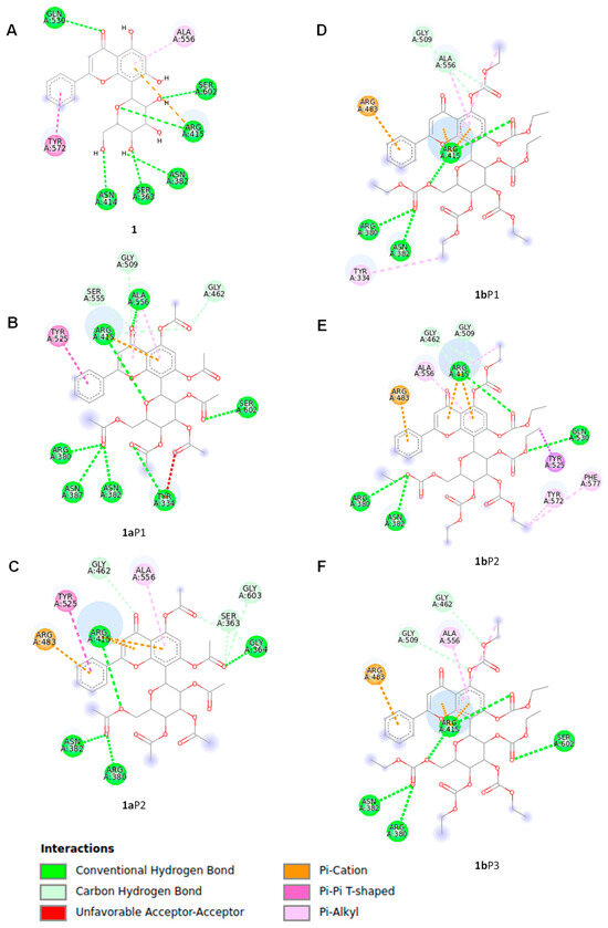 Molecular interactions of compounds 1, 1a, and 1b with Keap1 calculated by docking protocols. The protein data (PDB ID: 4ZY3) were extracted from the Protein Data Bank website (https://www.rcsb.org/). The docking protocol included the UCSF Quimera 1.15, Autodock Tools 1.5.6, and AutoDock Vina software. The molecular models of ligands 1, 1a, and 1b involved in the docking study were geometry-optimized global minimum conformers, which were found by the Monte Carlo search protocol in the MMFF94 force field, as executed in the Spartan’04 program, followed by geometry optimization by the DFT B3LYP/DGDZVP level of theory in the Gaussian 16 software. (A) One pose was determined for glucoside flavonoid 1, while two poses were found for derivative 1a represented by (B) 1aP1 and (C) 1aP2. Compound 1b showed three poses including (D) 1bP1, (E) 1bP2, and (F) 1bP3.