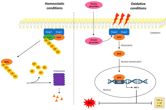 The multifunctional regulator Nrf2 controls the expression of a variety of cytoprotective and antioxidant genes, such as HO-1, which has been shown to down-regulate many pro-inflammatory mediators [4]. Chrysin has been reported to have potent antioxidant and anti-inflammatory activity by inducing the Nrf2/HO-1 axis in different in vitro and in vivo inflammation models [32,54]. To our knowledge, only one study has demonstrated that chrysin-8-C-glucoside induces a slight Nrf2 activation [19], and no studies have evaluated the effects of acetate or ethyl carbonate derivatives on the Nrf2/HO-1 pathway. Our data propose that the up-regulation of the Nrf2/HO-1 pathway could prevent the increase in ROS levels and the pro-inflammatory mediators TNF-α, IL-1β, and COX-2, thus attenuating the injury produced by oxidative stress and inflammation. This activity may be related to the overall 8-C-glucoside molecular skeleton since the stability of the C-C glucosidic linkage is warranted, thus hypothesizing a particular biological behavior when compared with the 8-O-glucoside or aglycone analogues [11].