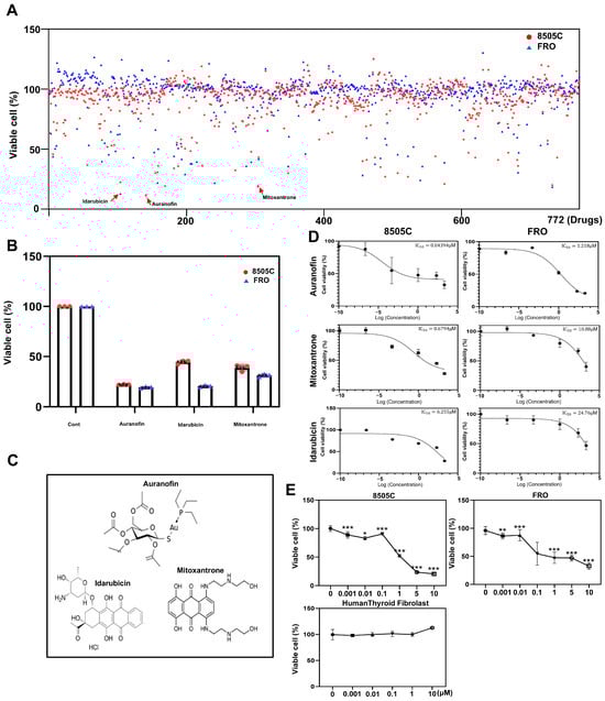 Screening of an FDA-approved library and auranofin as a potent drug for thyroid cancer treatment. (A) Schematic image of the screening strategy. (B) The cell viability was assessed by CCK-8 assay. Four drugs that showed <50% reduction in cell viability (% of control) at a concentration of 10 μM in 8505C and FRO cells. (C) Chemical structures of auranofin, idarubicin, mitoxantrone, and nisoldipine. (D) IC50 values of auranofin, mitoxantrone, and idarubicin were determined from a panel of 772 drugs. Cell viability decreased in a dose-dependent manner with increasing concentrations of each drug. (E) 8505C, FRO, and human thyroid fibroblasts were treated with auranofin (0, 0.001, 0.01, 0.1, 1, 5, 10 μM) or control for 24 h. The results are presented as means ± SD (n = 3). * p < 0.05, ** p < 0.01, *** p < 0.001.