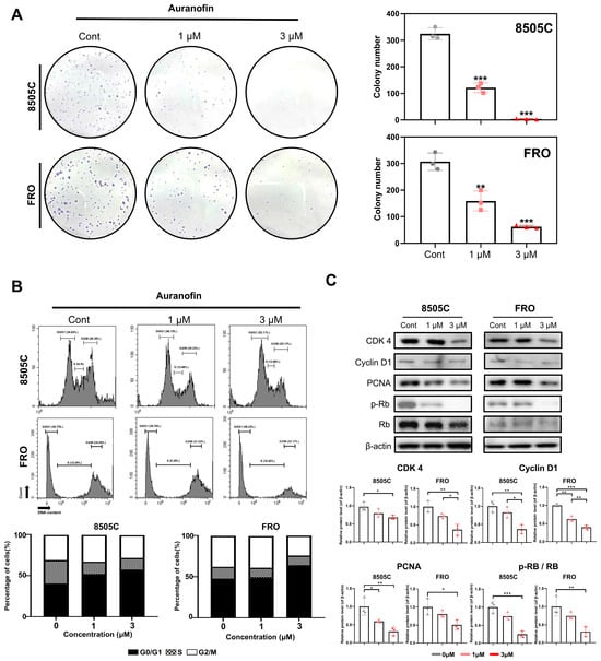 (A) Colony formation assay using 8505C and FRO cells was performed as described in the Materials and Methods Section (Section 3) (magnification, ×400). (B) Auranofin induces cell cycle arrest. Cells were treated with auranofin for 24 h, then analyzed by flow cytometry after PI staining. (C) The expression of G1/S phase cell cycle-associated proteins after treatment with auranofin. Whole lysates were subjected to Western blot analysis. The results are presented as means ± SD (n = 3). * p < 0.05, ** p < 0.01, *** p < 0.001.
