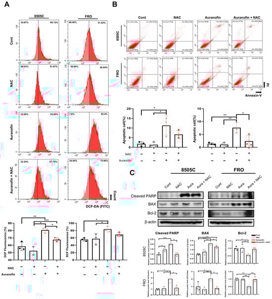 Auranofin induces ROS production and apoptosis in thyroid cancer cells. (A) Reactive oxygen species (ROS) were measured using flow cytometry with DCF-DA assay in thyroid cancer cells. Cells were treated with 3 μM auranofin with or without 1 mM NAC for 24 h and then reacted with DCF-DA for 24 h. (B) Auranofin induces apoptosis. Representative images of cell apoptosis stained with Annexin V-fluorescein isothiocyanate/propidium iodide (FITC/PI). Cells were treated with auranofin with or without 1 mM NAC for 24 h, then stained with Annexin V-FITC/PI, and analyzed by cytometry as described in the Materials and Methods Section (Section 3). (C) Expression of markers of apoptosis evaluated by Western blot analysis. Cells were treated with auranofin for 24 h. Western blot analysis showing the expression levels of cleaved PARP, BAX, and Bcl-2 in treated cells. The results are presented as means ± SD (n = 3). * p < 0.05, ** p < 0.01, *** p < 0.001.