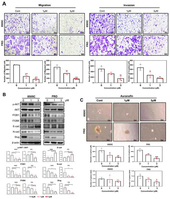 Auranofin suppresses invasion and sphere formation of thyroid cancer cells. (A) Effects of auranofin on thyroid cancer cell migration and invasion. Transwell migration and invasion assays were performed to investigate the effects of auranofin on the migration and invasion abilities of 8505C and FRO cell lines. The relative number of invaded or migrated cells following treatment with 1 and 3 μM of auranofin. Both migration and invasion were significantly decreased when compared to those of control cells. (B) Auranofin suppresses the expression of epithelial-to-mesenchymal transition marker proteins. The 8505C and FRO cells were treated with DMSO (Control) and 1 and 3 μM of auranofin. Whole-cell protein extracts were analyzed after 24 h of treatment by Western blot with the indicated antibodies. (C) Auranofin suppresses sphere formation. The 8505C and FRO cells were treated with DMSO (Control) and 1 and 3 μM of auranofin. All cells were grown in ultra-low attachment plates for 2 weeks. Quantification of the number and diameter of spheres (n = 3). The results are presented as means ± SD (n = 3). * p < 0.05, ** p < 0.01, *** p < 0.001.