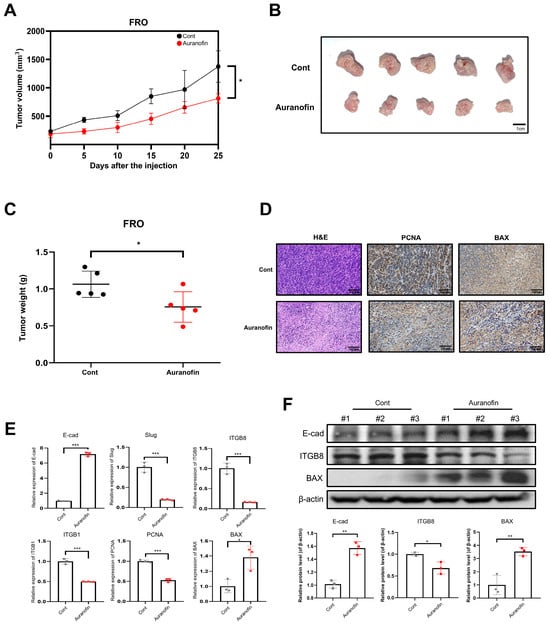 Treatment with auranofin inhibits tumor growth in a xenograft mouse model. (A) Anti-tumor efficacy of auranofin in the FRO xenograft mouse model. BALB/c mice (n = 5) were treated with PBS (Control) at 100 μM. Tumor volumes were recorded every 3 days. (B) Photographs of tumors in each group. Mice were sacrificed after 25 days of auranofin treatment. (C) Comparison of the final tumor weight and mouse weight in each group. (D) The tumor sections were subjected to IHC staining using antibodies against BAX and PCNA. (E,F) RT-PCR and Western blot analysis of changes in E-cad, Slug, ITGB8, ITGB1, PCNA, and BAX expression in tumor xenografts of mice treated with auranofin. The results are presented as means ± SD (n = 3). * p < 0.05, ** p < 0.01, *** p < 0.001.