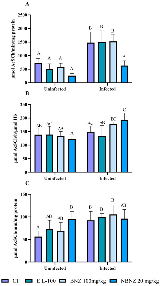 On the other hand, no alterations in the AChE blood activity (Figure 2B) were observed between the infected and uninfected groups of CT, EL-100, and BNZ. However, the infected NBNZ group showed a significant AChE enzyme activity compared to the uninfected NBNZ group. It was observed that there were no significant differences between treatments of infected groups. The enzyme activity in the cortex (Figure 2C) showed elevation only for the infected and uninfected CT groups.