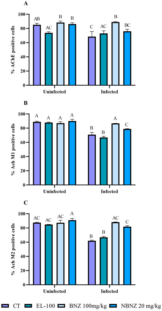 The muscarinic receptors M1 and M2 (Figure 3B,C and Figure 4) showed significant expression in the infected CT and EL-100 groups in relation to their uninfected groups. The infected BNZ group showed a more substantial receptor expression than the infected CT group. Moreover, the NBNZ’s M1 and M2 expression was higher compared to that of the uninfected group and the infected CT group.