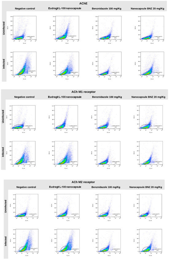 Moreover, flow cytometry was used to analyze the AChE expression of lymphocytes and the muscarinic receptors (M1 and M2) involved in immune response. The AChE expression (Figure 3A and Figure 4) was lower in the infected CT group than in the uninfected CT group, as can be observed in the representative histograms. However, there was a significant increase in AChE expression in the infected BNZ group compared to that in the infected CT group.