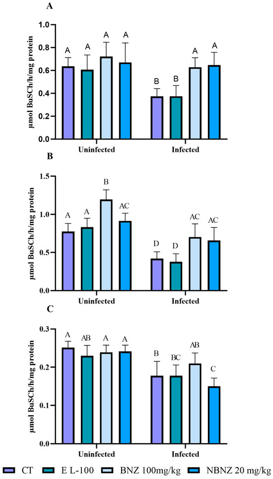The enzyme activity in the liver (Figure 5B) is lower in the infected CT, EL-100, and BNZ groups than in their corresponding uninfected groups. Moreover, there was no difference in enzyme activity between the infected NBNZ and the uninfected NBNZ group. Still, the infected BNZ group showed significant enzyme activity when compared to the infected CT group. In the cortex (Figure 5C), a lower BuChE activity was observed in the infected CT and NBNZ groups compared to their corresponding uninfected groups. In addition, the infected NBNZ group showed a lower BuChE activity than the infected CT group.