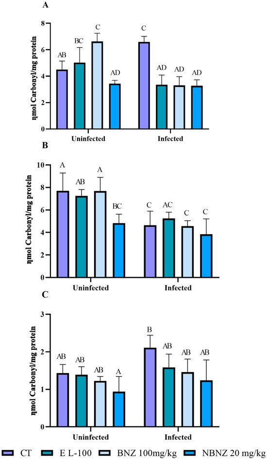 Oxidative stress was evaluated in the liver, kidney, and cortex tissue using several oxidative parameters. Protein carbonylation in the liver (Figure 6A) was significant in the infected CT group compared to the uninfected CT group. However, protein carbonylation in the liver was lower in the infected EL-100 and BNZ groups than in their corresponding uninfected groups and the infected CT group. The infected NBNZ showed no difference in protein carbonylation in the liver compared to its uninfected group, but protein carbonylation was lower in the infected NBNZ than the infected CT group.