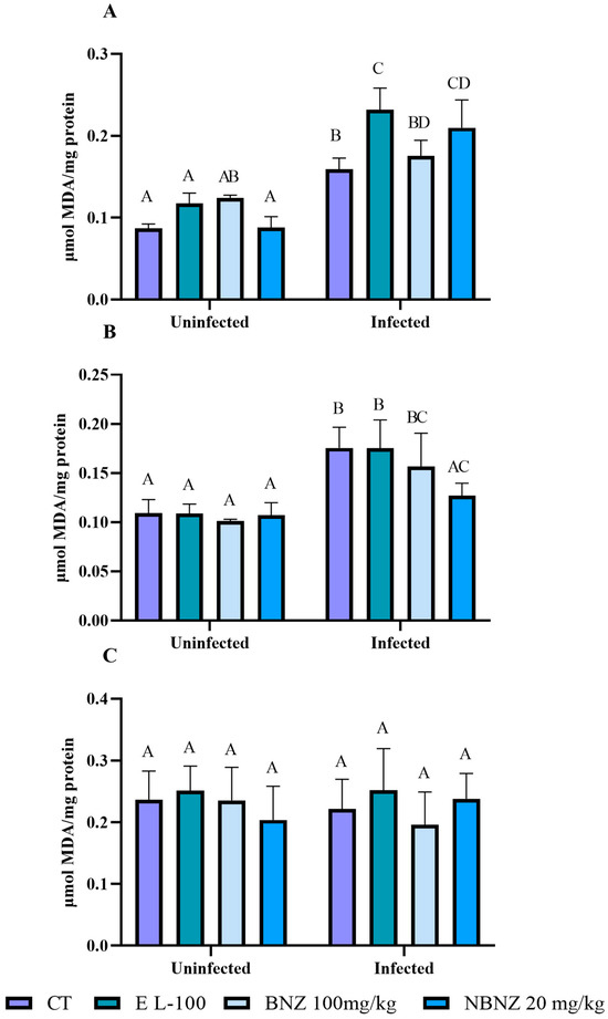 In the kidney (Figure 7B) analysis, a similar standard to the liver was observed, with more significant MDA levels in the infected CT, EL-100, and BNZ groups than in other groups. However, the infected NBNZ groups had no significant difference compared to the uninfected groups but showed lower MDA levels than the infected CT group. The evaluation of the cortex MDA levels (Figure 7C) showed no significant differences between all groups.