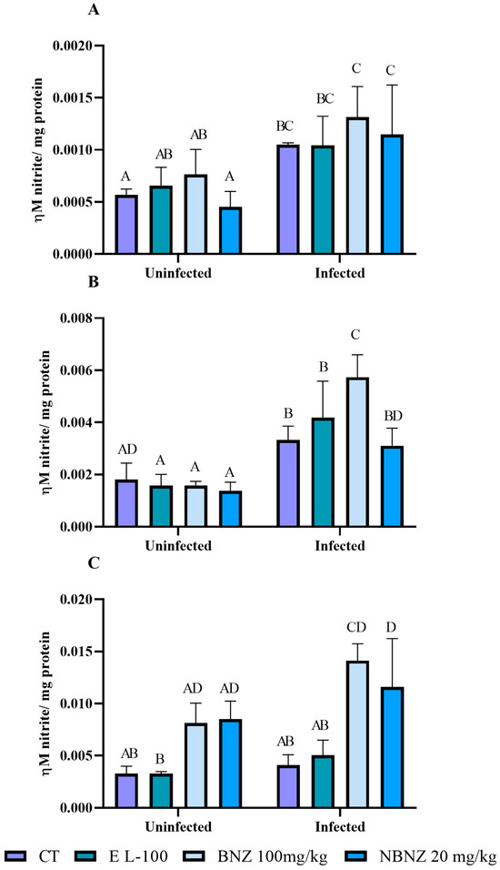Nitrite levels in the liver sample (Figure 8A) were higher in the infected CT, BNZ, and NBZ groups compared to their corresponding uninfected groups. In addition, the BNZ and NBNZ promote primary NOx levels in the infected groups compared to the infected CT groups. There were no differences between treatments within the uninfected groups and the infected groups. A similar result to the liver was observed for the NOx kidney (Figure 8B). The NOx levels in the infected groups (CT, EL-100, BNZ, and NBNZ) were higher compared to their respective uninfected groups. Moreover, the infected BNZ group showed primary NOx levels compared to other infected groups. The cortex NOx levels (Figure 8C) were more significant in the infected BNZ and NBNZ groups than in the infected CT and EL-100 groups. The same can be observed in the comparison between the uninfected groups.