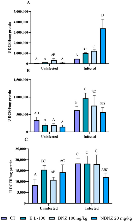 The liver ROS levels (Figure 9A) were higher in the infected EL-100, BNZ, and NBNZ groups compared to their corresponding uninfected groups. Moreover, the infected EL-100, BNZ, and NBNZ groups demonstrated higher ROS levels than the infected CT group. In kidney evaluation (Figure 9B), more significant ROS levels were observed in all infected groups than in their respective uninfected groups. The cortex ROS levels (Figure 9C) were higher in the infected groups, and the difference in cortex ROS levels was significant between the infected and uninfected groups of CT and BNZ.