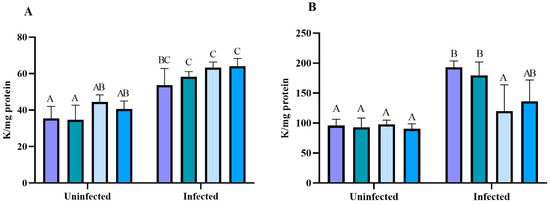 The glutathione-S transferase activity, TSH, and NPSH were evaluated in the liver, kidney, and cortex samples (Supplementary Material—Figure S1). The GTS activity in the liver (Figure S1A) was higher only in the infected BNZ group compared to the uninfected BNZ group; other groups presented no differences. The kidney (Figure S1B) and cortex (Figure S1C) enzyme activity had no differences in group comparison. The liver THS levels (Figure S2A) were more significant in the infected groups (CT, EL-100, and NBNZ) than in their corresponding uninfected groups. The THS levels of the kidney (Figure S2B) were higher in the infected BNZ group compared to its corresponding uninfected group. The cortex (Figure S2C) presents no differences between groups. The NPSH levels were evaluated in the liver, kidney, and cortex, and there were no differences between groups (Figure S3A–C).