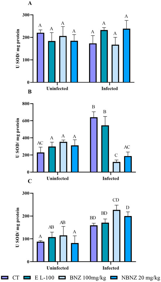 There was no significant difference in the SOD activity between groups in the liver tissue (Figure 11A). However, in the kidney tissue (Figure 11B), a more significant SOD activity was observed in the infected CT and EL-100 groups compared to their corresponding uninfected groups. On the other hand, the animals have a lower SOD activity in the infected BNZ and NBNZ groups than the infected CT and EL-100 groups. The cortex SOD activity (Figure 11C) was more significant in the infected groups (CT, BNZ, and NBNZ) than in their respective uninfected groups.