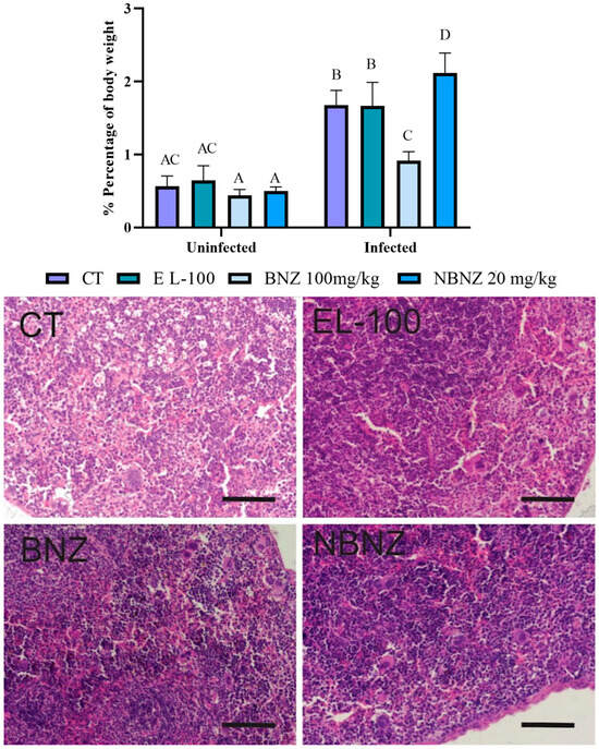 Spleen evaluation of mice experimentally infected by T. cruzi. Graphic demonstration of the spleen percentage of body weight (difference illustrated per different letter: A–D, the same letters represent no difference between groups (AC)). Photomicrography of the spleen tissue of mice experimentally infected by T. cruzi. CT: infected and untreated; EL-100: infected and treated with vehicle; BNZ: infected and treated with 100 mg/kg of BNZ; and NBNZ: infected and treated with 20 mg/kg of NBNZ. Stained with hematoxylin and eosin (H&E). Scale bar = 100 mm.