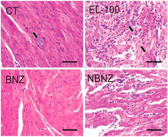 Histopathological images of the cardiac tissue of mice experimentally infected by T. cruzi. CT: infected and untreated; EL-100: infected and treated with vehicle; BNZ: infected and treated with 100 mg/kg of BNZ; and NBNZ: infected and treated with 20 mg/kg of NBNZ. Arrows show amastigote nests. Stained by H&E. Scale bar = 50 mm.