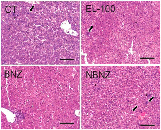 Histopathological images of the liver tissue of mice experimentally infected by T. cruzi. CT: infected and untreated; EL-100: infected and treated with vehicle; BNZ: infected and treated with 100 mg/kg of BNZ; and NBNZ: infected and treated with 20 mg/kg of NBNZ. * Inflammatory infiltrate; arrows show activated macrophages. Stained by H&E. Scale bar = 100 mm.