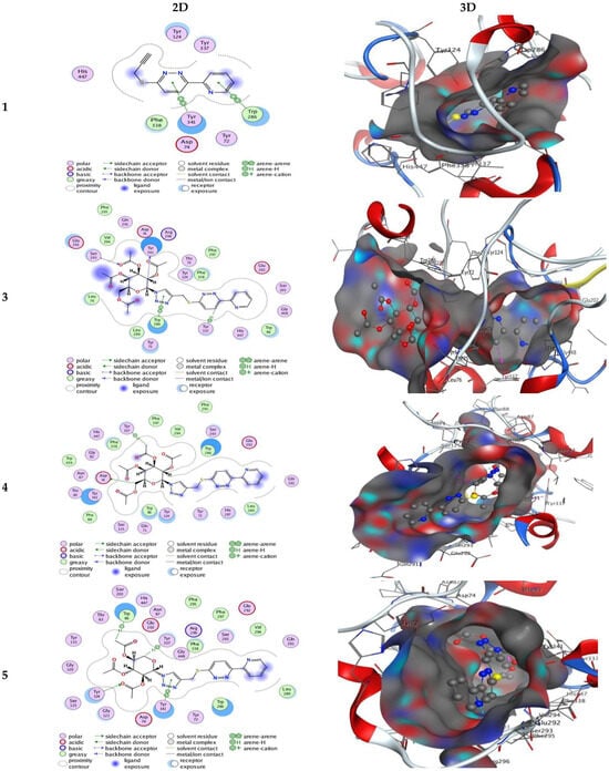 In comparison, compound 6, the diastereomer of compound 5 with an acylated ribofuranosyl moiety, displayed much weaker inhibition (IC50 = 9.152 µM for AChE, 31.99 µM for BuChE) and a lower docking score (−6.35 kcal/mol). Despite multiple hydrogen bonds and pi–pi interactions with residues such as Trp 286, its stereochemistry appears to hinder effective alignment within the active site, highlighting the critical impact of stereochemistry on enzyme inhibition.