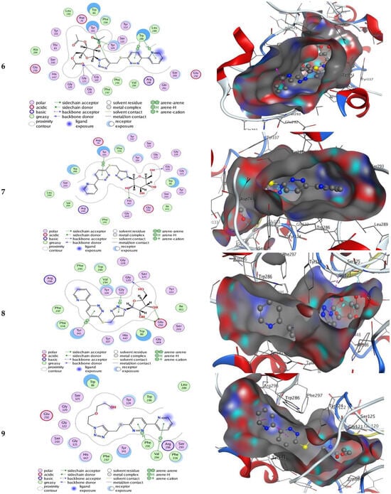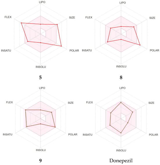 The results of testing the oral bioavailability of 5, 8, 9, and donepezil are shown in Figure 8. An oral bioavailability radar displays polarity (POLAR), size (SIZE), saturation (INSATU), flexibility (FLEX), solubility (INSOLU), and lipophilicity (LIPO) distribution. Lines in red depict the material’s calculated physicochemical qualities, whereas pink lines depict the best value for each parameter. All oral bioavailability markers for compound 9 were in pink, like donepezil. Except for the POLAR parameter, all the quantifiable physicochemical values for 8 fell inside the pink zone, indicating a favorable profile. Compound 5, on the other hand, displayed a clear violation of the POLAR and FLEX criteria.