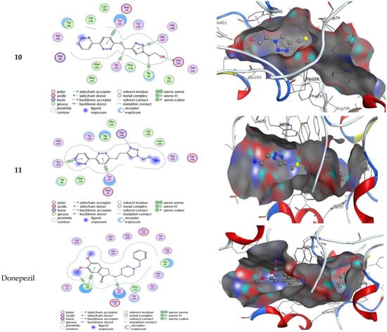 Two-dimensional and three-dimensional interactions of 1 and 3–11 and donepezil in the active site of AChE (PDB ID: 4EY7).