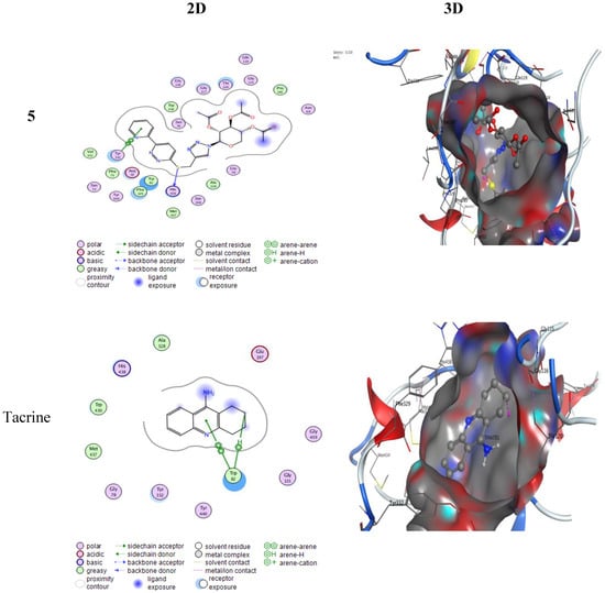 Two-dimensional and three-dimensional interactions of 5 and tacrine in the active site of BuChE (PDB ID: 4BDS).