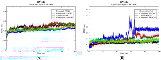 RMSDs of the target enzymes; protein backbone RMSD (A), AChE, BuChE, and compound 5 in complex with the 2 targets (B) throughout 100 ns MD simulation.