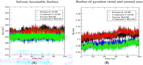 Structural dynamics of compound 5 bound to the 2 target proteins; SASA values (A) and Radius of Gyration of the target enzymes; AChE and BuChE in complex with compound 5 (B) calculated during the 100 ns of MD trajectories.