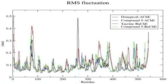 To investigate the stability of interactions between compound 5 and cholinesterase enzymes, we conducted 100-nanosecond (ns) molecular dynamics (MD) simulations using GROMACS-2023.1 [72] for both acetylcholinesterase (AChE, PDB ID: 4EY7) and butyrylcholinesterase (BuChE, PDB ID: 4BDS). The protein backbone RMSD for both enzymes (Figure 4A) indicated remarkable structural stability, with AChE fluctuations remaining under 0.05 nm and BuChE maintaining stability during binding. The ligand RMSD analysis (Figure 4B) revealed that compound 5 exhibited slightly higher fluctuations compared to donepezil in AChE and tacrine in BuChE, but these remained within an acceptable range, demonstrating overall stable binding.