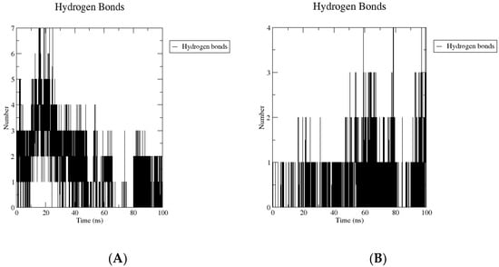 Intermolecular H-bonds of compound 5 bound to AChE (A) and BuChE (B) during the 100 ns of MD trajectories.