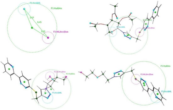 Upper left panel: Pharmacophore features and distances. Upper right panel: Superposition of 5 with the query. Lower left panel: Superposition of 8 with the query. Lower right panel: Superposition of 9 with the query.
