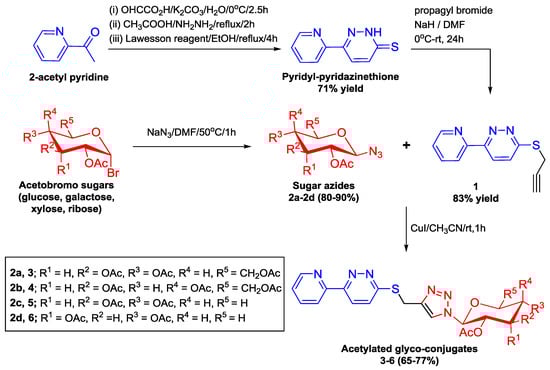 An essential intermediate in the synthesis of the title compounds is 5-(pyridazin-3-yl)pyridin-2(1H)-thione. The process of synthesizing the latter compound involves multiple steps, as illustrated in Scheme 1 [70,71]. Subsequently, the thione derivative underwent propargylation in the presence of propargyl bromide in anhydrous DMF, leading to the formation of its alkyne form 1, which was confirmed by IR, 1H NMR and 13C NMR. The alkynyl derivative produced exhibited characteristic acetylenic absorption bands at 3314 and 2218 cm−1 in the IR spectrum. Additionally, the 1H NMR spectra showed signals corresponding to the acetylene proton of the propargyl group and the methylene protons at δ = 3.17 and 4.18 ppm, respectively. The 3-(6-(prop-2-yn-1-ylthio)pyridin-3-yl)pyridazine 1, with a free terminal alkyne group, underwent successful click reactions with a selection of sugar azides, namely tetra-O-acetyl-β-D-gluco-, tetra-O-acetyl-β-D-galacto-, tri-O-acetyl-β-D-xylopyranosyl, and tri-O-acetyl-β-D-ribofuranosyl azides 2a–d, respectively, to afford the corresponding triazole-linked pyridazine glycoconjugates 3–6 in good yields (65–73%) as shown in Scheme 1. The combination of elemental analyses and spectral data confirmed the structures of the prepared series 3–6. As an illustration within the prepared series, compound 3 exhibited analytical data revealing a molecular formula of C26H28N6O9S (M+ 600). The infrared spectra distinctly indicated the absence of the alkyne groups present in the precursor, propargylated 1. In the 1H NMR spectrum, the proton at the anomeric position in the glucose part displayed a doublet at δ 5.93 ppm, with a coupling constant of J = 8.8 Hz, indicating the β-configuration of the glucopyranose section connected to the 1,2,3-triazole ring. Other glucopyranose protons ranged from δ 4.01–5.52 ppm, and the four acetoxy groups appeared as singlets between 1.88 and 2.08 ppm. The triazole CH in the new 1,2,3-triazole ring was observed as a singlet at 8.00 ppm. In the 13C NMR spectrum, acetoxy carbonyl carbon atoms from the sugar component were detected at δ 168.9–170.5 ppm. Simultaneously, acetate methyl carbon atoms appeared at δ 20.3–20.9 ppm. The spectrum displayed six peaks from δ 62.3–84.4 ppm for the sugar chain. Peaks at δ 123.2 and 144.5 ppm represented the triazole ring, and peaks at δ 121.1, 124.8, 126.0, 127.1, 138.1, 150.0, 152.8, 156.7, and 162.8 ppm indicated the pyridine and pyridazine rings (See Supplementary Materials).