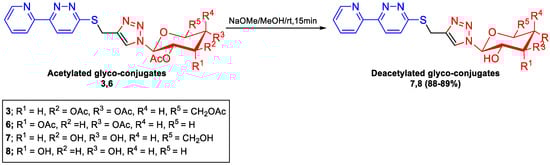 Deprotection of glycoconjugates 3 and 6 was achieved by treating them with sodium methoxide in dry methanol, leading to the formation of glycosides 7 and 8, as illustrated in Scheme 2. In these glycosides, the sugar components had free hydroxyl groups, which were confirmed by their presence in the IR spectrum. The absence of acetyl methyl proton signals in the 1H NMR spectra of these products further confirmed the deacetylation process and validated their formation.