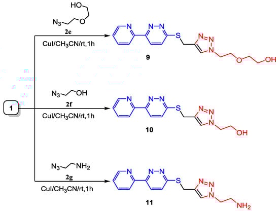 Similarly, in accordance with the click reaction conditions, the terminal alkyne group in compound 1 underwent a series of reactions with various acyclic azide derivatives, including 2-(2-azidoethoxy)ethan-1-ol 2e, 2-azidoethan-1-ol 2f, and 2-azidoethan-1-amine 2g (see Scheme 3). This process resulted in the formation of products 9, 10, and 11 with yields of 72%, 69%, and 65%, respectively. The structures of these newly formed products were verified using 1H NMR and 13C NMR spectroscopy, which displayed the anticipated signals for the hydrogens and carbon atoms at their respective positions (See Section 3 and Supplementary Materials).