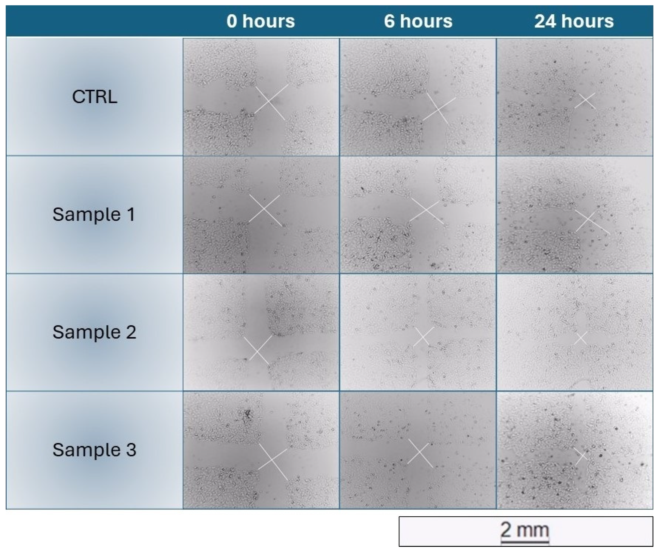 Figure 2. Microscopic images documenting the in vitro healing effect of the different samples (10 μg/mL) in human keratinocytes (HaCaT) through the scratch test.