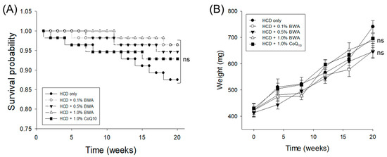 Survival probability (A) and body weight change (B) in zebrafish across the different groups during 20 weeks of consumption of the respective diets. HCD stands for the high-cholesterol diet, while BWA and CoQ10 stand for beeswax alcohol and coenzyme Q10, respectively. “ns” represents the non-significant difference between the groups. The Kaplan–Meier survival analysis followed by the log-rank test was used to determine the survivable probability curve, while ANOVA followed by Tukey’s post hoc analysis was used for the statistical analysis of the body weight.
