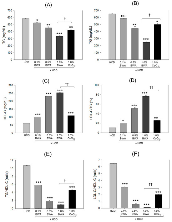 As shown in Figure 2A,B, the highest level of total cholesterol (TC; 584 mg/dL) and triglyceride (TG; 651 mg/dL) were detected in the HCD-only group following 20 weeks of consumption. Co-consumption of BWA efficiently altered the HCD-induced high levels of TC in a dose-dependent manner. A significant reduction of 43.2% (p < 0.001) in TC was quantified in the 1.0% BWA group compared with the HCD-only group, while the 1.0% coenzyme Q10 (CoQ10) group showed 27.7% lower (p < 0.01) TC levels than the HCD-only group. Importantly, the 1.0% BWA group exhibited 21.5% lower (p < 0.05) TC levels than the 1.0% CoQ10 group, suggesting that BWA showed higher efficacy in treating hypercholesterolemia induced by HCD supplementation.