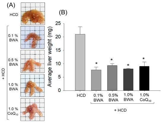 Comparison of liver morphology and size among zebrafish after 20 weeks of consumption of different diets. (A) Images of the whole liver and (B) liver weight of zebrafish following 20 weeks of consumption of different diets. HCD stands for the high-cholesterol diet, while BWA and CoQ10 stand for beeswax alcohol and coenzyme Q10, respectively. * (p < 0.05) depicts the level of significance with respect to the HCD group.