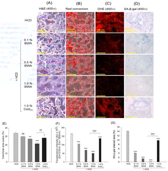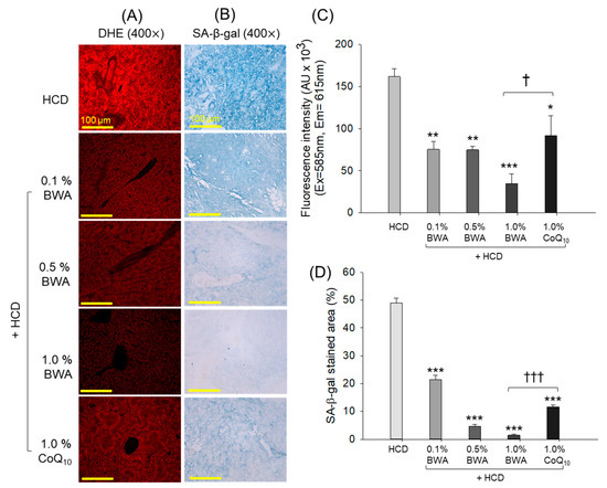 As shown in Figure 6B, senescence-associated β-galactosidase (SA-β-gal) staining revealed that the HCD-only group exhibited the most severe cell senescence, around 54.5% of SA-β-gal-positive cells, suggesting that the 20 weeks of consumption of a high-cholesterol diet resulted in severe cellular senescence in the liver. The consumption of BWA and CoQ10 substantially prevented HCD-induced senescence (Figure 6B,D). Compared with 1.0% CoQ10, 1.0% BWA exhibited a significant reduction of 84.2% (p < 0.001) in SA-β-gal-positive cells, demonstrating BWA enhanced efficacy over CoQ10 in mitigating HCD-induced cellular senescence.