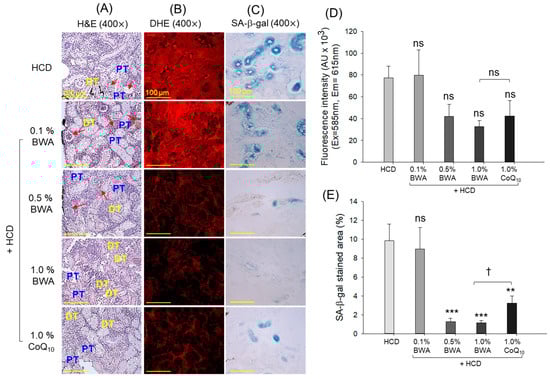 Analysis of kidney histology of zebrafish at 20 weeks of consumption of different diets. (A) Hematoxylin and eosin staining: proximal and distal tubules are represented by PT and DT, respectively, and the red arrows indicate luminal debris. (B) Dihydroethidium (DHE) fluorescent staining was used to detect reactive oxygen species (ROS). (C) Senescence-associated β-galactosidase (SA-β-gal) staining [scale bar, 100 μm]. (D) Image J software-derived DHE fluorescent intensity quantification. (E) Quantification of SA-β-gal-stained area. HCD stands for the high-cholesterol diet, while BWA and CoQ10 stand for beeswax alcohol and coenzyme Q10, respectively. ** (p < 0.01) and *** (p < 0.001) depict the level of significance with reference to the HCD group. † (p < 0.05) highlights the significance between the 1.0% BWA and 1.0% CoQ10 groups; the non-significant differences between the groups are represented by “ns”.