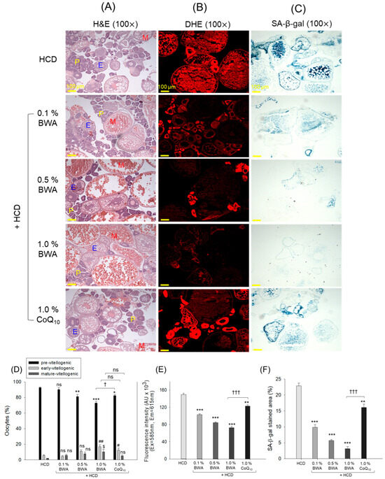 As shown in Figure 9A,D, the HCD-only group showed the highest previtellogenic oocyte content (~93%) and the lowest mature-vitellogenic oocyte content (~2%), indicating the adverse effect of HCD supplementation on the impairment of oocyte development. The co-consumption of BWA improved HCD-impaired oocyte development in a dose-dependent manner, especially at 1.0%. The BWA group showed the lowest previtellogenic oocyte content (~73%) and the highest mature-vitellogenic oocyte content (~10%). Also, CoQ10 consumption substantially affected the restoration of HCD-altered oocyte counts. Between the 1.0% consumption of BWA and CoQ10, BWA displayed a significant 12.1% (p < 0.05) reduction in previtellogenic oocyte content, indicating the superior functionality of BWA in addressing HCD-induced ovary impairment.