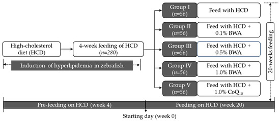 All the zebrafish (~16 weeks old) were exclusively fed the HCD for 4 weeks before segregation into different groups. After four weeks of feeding on the HCD, the zebrafish (n = 280) were arbitrarily allocated to five distinct groups (n = 56/group) (Figure 10). The zebrafish in group I were continuously fed only the HCD. The zebrafish in groups II, III and IV were fed HCD + 0.1% BWA, HCD + 0.5% BWA and HCD + 1.0% BWA, respectively. The group V zebrafish were fed HCD + 1.0% CoQ10. Each group’s zebrafish (n = 56) were divided into four sets (n = 14/tank) and fed the specified diets for 20 weeks. Each set (n = 14) of different groups received 140 mg of the respective diets/tank twice a day in the morning and evening (i.e., a total of 280 mg/day, ~equivalent to 20 mg/day/zebrafish). Over the 20-week consumption period, zebrafish survivability was monitored every day.