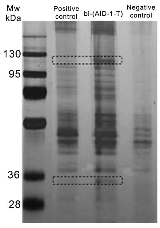 4–20% PAGE electrophoresis of proteins obtained after incubation of cell lysates with biotin-labeled control oligonucleotide (positive control) and biotin-labeled bi-(AID-1-C) after the first column elution. The negative control contains oligonucleotide-untreated protein lysate after the first elution. The dotted line shows excised regions of the gel that were further analyzed.
