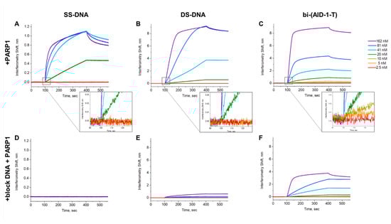 Data on interferometry biolayer interaction of recombinant PARP1 protein at 162, 81, 41, 20, 10, 5 and 2.5 nM concentrations (A–C), or PARP1 at the same concentrations in the presence of blocking double-stranded DNA at 0.1 mg/mL (D–F) with different types of oligonucleotides: SS-DNA single-stranded oligonucleotide (A,D), structured double-stranded oligonucleotide DS-DNA (B,E), and bi-(AID-1-T) (C,F). The association initiation region is shown enlarged for figures (A–C).