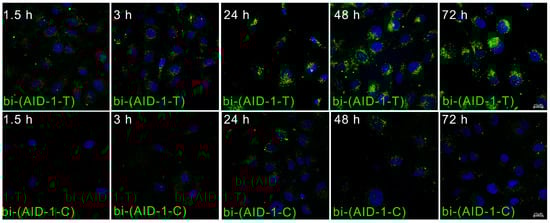 For this study, two G-quadruplex conjugates, bi-(AID-1-T) and bi-(AID-1-C), each tagged with a fluorescent FAM label at the 3′ end, were synthesized. Time intervals of 1.5, 3, 24, 48, and 72 h, along with a concentration of 1 μM, were used to analyze the penetration of G-quadruplexes into tumor cells. Bi-(AID-1-T) began to accumulate as early as 1.5 h post-addition, reaching its maximum representation by 24 h, and maintaining this accumulation intensity for up to 72 h following exposure. In contrast, the accumulation of the G-quadruplex bi-(AID-1-C) starts only after 3 h, increasing by 24 h, and remained stable for 72 h after co-incubation with tumor cells. Consequently, bi-(AID-1-T) exhibited a gradual accumulation of the aptamer in the cytoplasm and perinuclear space. In comparison, the accumulation intensity of bi-(AID-1-C) was significantly lower, and the distribution of the aptamer within the cytoplasm was uniform, albeit at a slower rate (Figure 3). It could not be excluded that bi-(AID-1-C) is able to exert some extracellular impact, and this requires further thorough study.