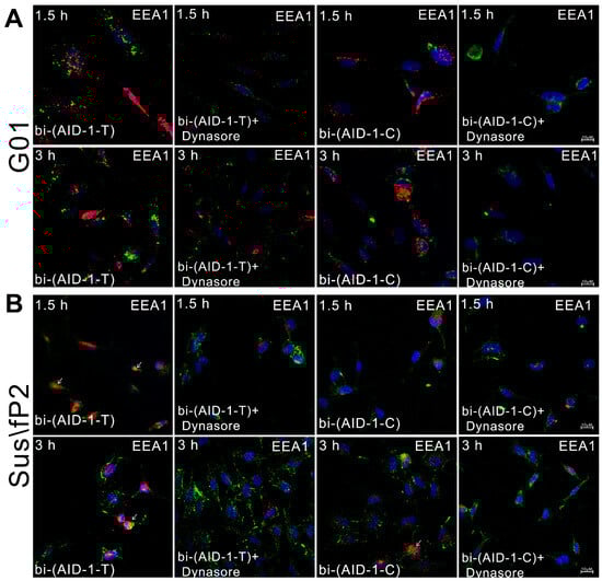 To investigate the role of dynamin-dependent endocytosis in the cellular uptake of bi-(AID-1-T) and bi-(AID-1-C), we utilized Dynasore (Abcam, Cambrige, UK), a small molecule that inhibits the GTPase activity of dynamin-1, dynamin-2, and Drp1. Thus, Dynasore inhibits dynamin-dependent endocytosis by preventing the formation of endocytic vesicles [42,43]. To confirm the efficacy of the inhibitor, we employed staining for the early endosome marker EEA1.