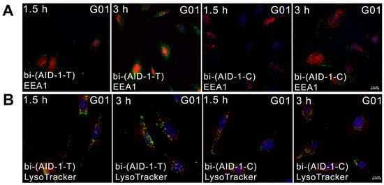 The bi-(AID-1-T) aptamer was found to be slightly present in early endosomes and undetectable in lysosomes, while bi-(AID-1-C) did not penetrate either early endosomes (Figure 5A) or lysosomes (Figure 5B) at 1.5 and 3 h.