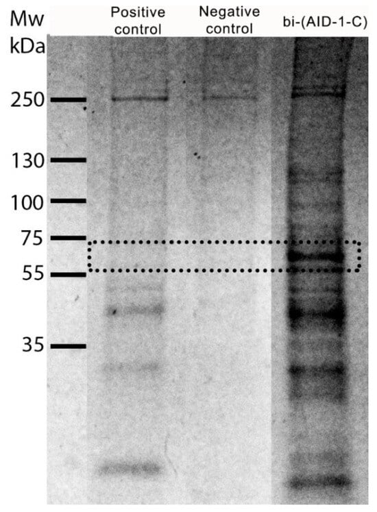 Based on the distinct differences in the mode and rate of penetration of bi-(AID-1-T) and bi-(AID-1-C) into cells, it is expected that their target proteins will also differ. The pull-down method, followed by mass spectrometry, was used to identify the target proteins for bi-(AID-1-C), similar to the approach used for bi-(AID-1-T). The methodology of this study was consistent with prior research. Consequently, biotin-labeled bi-(AID-1-C) was found to interact specifically with cellular proteins in the range 55–75 kDa (Figure 6). The full image is presented in the Supplementary Data (Figure S2). Subsequent mass spectrometric analysis revealed that bi-(AID-1-C) has high specificity for the nuclear protein RU17 (SNRNP70) (Table 4, Supplementary Table S2).